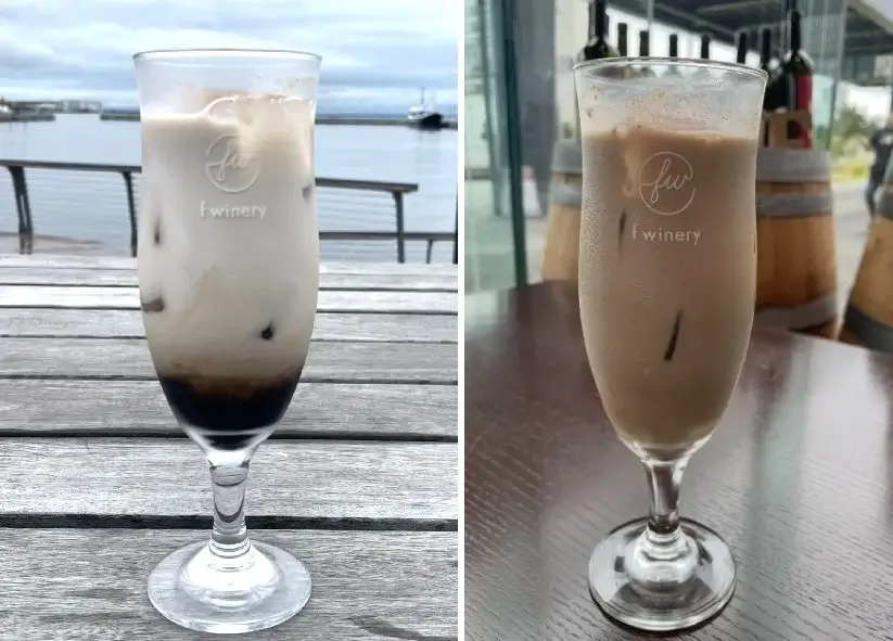 お茶好きの方に特に注目していただきたいのが、この茶色のドリンクです。チャイティーをベースに、ウイスキーと牛乳を合わせ、シナモンパウダーをアクセントにした一品。混ぜるとやわらかな茶色に変化する様子も楽しめます。
